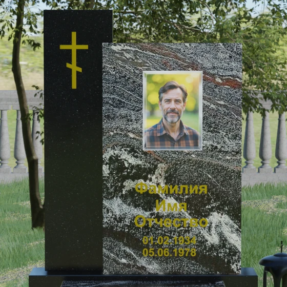 Визуальное решение данного мемориала строится на благородном контрасте двух вертикальных элементов, что позволяет создать глубокий и многогранный художественный образ. Композиция состоит из двух стел разной высоты, установленных внахлест. Более высокая и узкая стела служит духовным стержнем комплекса: на её полированной поверхности закреплен лаконичный православный крест. Его строгие линии и золотистое покрытие подчеркивают святость места и символизируют надежду на вечную жизнь. Широкая основная панель выступает в качестве смыслового центра, где располагается портрет и основные памятные надписи. Использование фотокерамики или портрета на стекле в специальной нише придает образу особую четкость и глубину, гармонируя с зеркальной поверхностью камня.