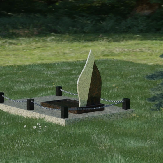 Центральным элементом ансамбля является вертикальная стела, чья форма напоминает застывшее пламя свечи или небесную слезу. Дизайн построен на изысканном контрасте двух видов камня, что придает монументу объем и динамику. Основная часть выполнена из глубокого темного гранита с идеальной зеркальной полировкой, в которой отражается небо, создавая ощущение чистоты и бесконечности. Правая грань стелы дополнена изящным «крылом» из более светлого, фактурного камня. Этот плавный изгиб символизирует жизненный путь, который никогда не бывает прямолинейным, и одновременно дарует чувство легкости и покоя.