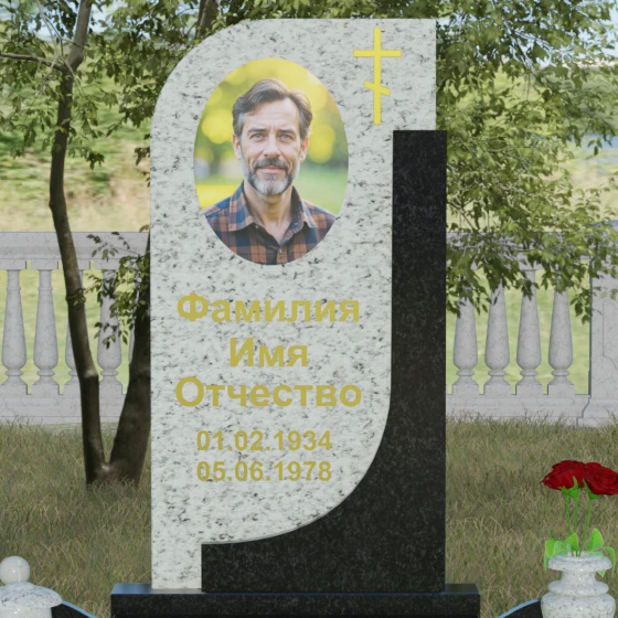 Данная модель отличается уникальной комбинированной архитектурой, которая мгновенно приковывает взгляд за счет игры форм и цветов. Основная вертикальная стела имеет асимметричный силуэт: ее левая сторона плавно закругляется, образуя изящную волну, в то время как правая грань остается подчеркнуто строгой и прямой. Это сочетание мягкости и твердости символизирует дуальность жизни. С правой стороны стелу дополняет контрастная вертикальная вставка из камня другого оттенка, которая придает всей конструкции объем и архитектурную завершенность. В верхней части основной плиты лаконично расположен православный восьмиконечный крест, выполненный методом глубокой гравировки с последующим золочением. Его строгие линии подчеркивают духовную значимость монумента, не перегружая общую композицию лишними деталями.