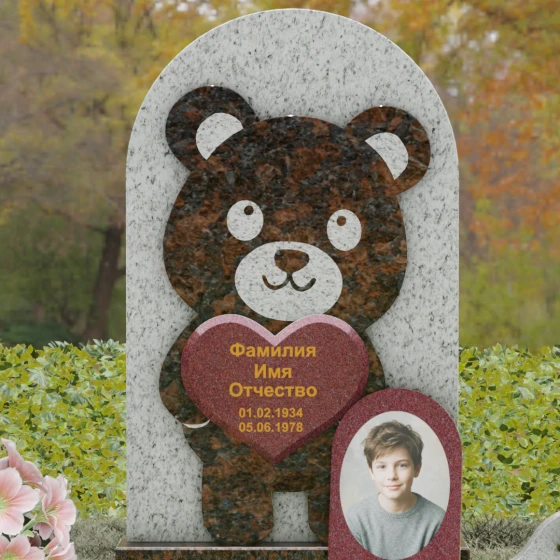Данная мемориальная композиция представляет собой уникальное сочетание трогательной нежности и величественной непоколебимости камня. В центре художественного замысла лежит глубокий символизм: фигура медвежонка, бережно держащего в лапах сердце, олицетворяет чистоту, бесконечную родительскую любовь и защиту, которую близкие стремятся подарить даже после ухода дорогого человека. Это надгробие из натурального камня выполнено в технике художественного комбинирования различных пород, что создает потрясающий визуальный объем. Массивная светлая стела с полукруглым завершением служит идеальным фоном для темного силуэта, вырезанного с ювелирной точностью. Игра контрастов между зеркальной полировкой черного камня и благородной текстурой светлого гранита подчеркивает каждую деталь: от доброго взгляда лесного покровителя до мягких контуров его фигуры.