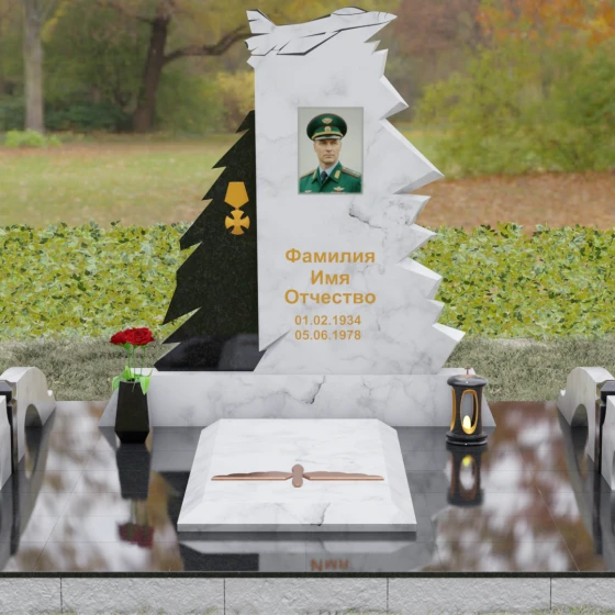 Эстетика данного мемориала строится на глубоком уважении к деталям: от золоченой гравировки ордена на резной «ветви» камня до безупречной компоновки портрета и надписей, которые гармонично вписаны в общую архитектонику стелы.