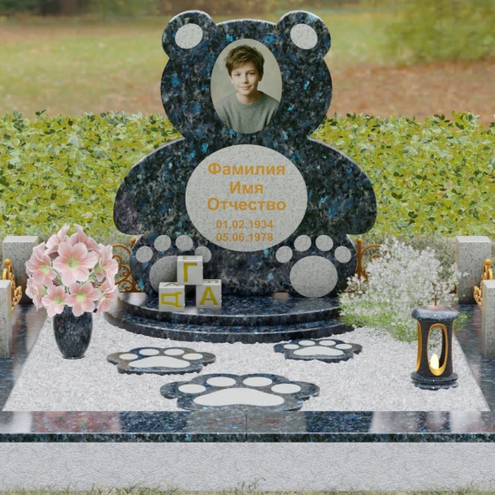 • Благоустройство: Композиция включает в себя не только стелу, но и продуманный ансамбль из гранитных кубиков-литер, напоминающих детские игрушки, что подчеркивает индивидуальность захоронения.