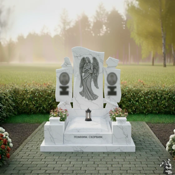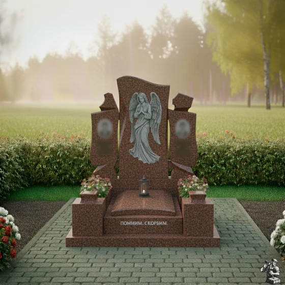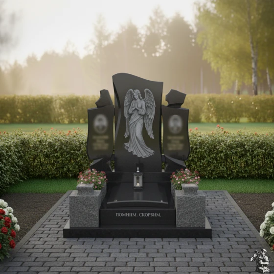 Особое внимание привлекает искусно выполненная резьба на центральной части монумента. Здесь изображен ангел с опущенными крыльями, склонивший голову в молитве или глубокой скорби. Каждая деталь его одеяния, каждая складка ткани, каждое перо на крыльях проработаны с невероятной точностью. Матовая фактура резьбы контрастирует с зеркальной полировкой основного камня, создавая потрясающую игру света и тени, которая придает изображению объем и глубину. Кажется, что ангел вот-вот оживет, наполняя пространство тихим утешением. Справа и слева от центрального изображения ангела, на боковых элементах, расположены две вставки овальной формы, предназначенные для портретов усопших, их матовая поверхность мягко выделяется на фоне глянцевого камня, создавая гармоничный акцент.