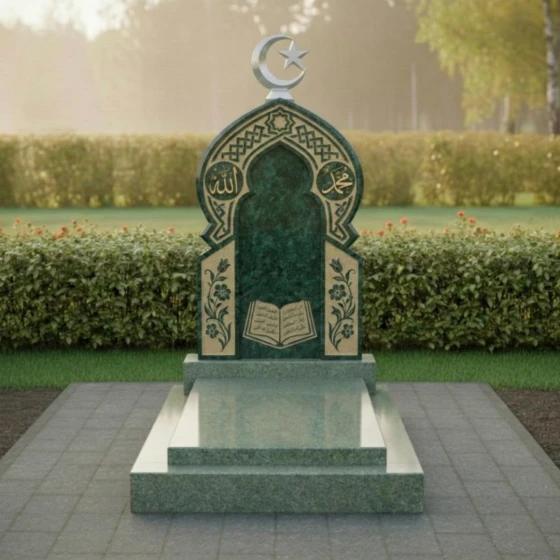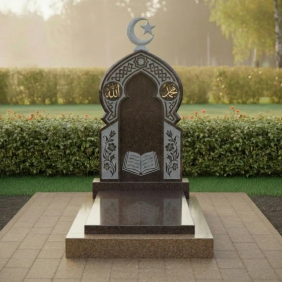 Ритуальное изделие артикула ПН 510 представляет собой глубокое художественное осмысление вечности и памяти, воплощенное в камне. Это не просто надгробие, а целая архитектурная форма, призванная стать молчаливым свидетельством уважения и любви. Центральная стела, выполненная в глубоком черном цвете, символизирует безмятежность и покой, а ее очертания напоминают величественный вход в священное пространство. Верхняя часть стелы увенчана исламским полумесяцем со звездой, выполненным из светлого камня, что создает выразительный контраст и придает композиции духовную значимость.