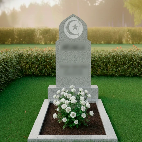 Данный мемориальный ансамбль представляет собой истинное воплощение благородства и духовной глубины. Величественная стела, выполненная в форме традиционного восточного купола или стрельчатой арки, сразу приковывает взгляд своей безупречной геометрией. Главным художественным акцентом композиции является искусно интегрированный медальон из белоснежного мрамора, расположенный в верхней части обелиска. В центре этого светлого круга филигранно вырезаны символы веры — полумесяц и пятиконечная звезда. Контраст между глубоким темным цветом основного камня и матовой чистотой мраморной вставки создает эффект небесного свечения, подчеркивая торжественность и значимость момента памяти. Плавные, но при этом строгие линии резьбы по контуру стелы свидетельствуют о высочайшем уровне камнерезного мастерства, превращая холодный камень в одухотворенное изваяние.