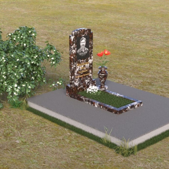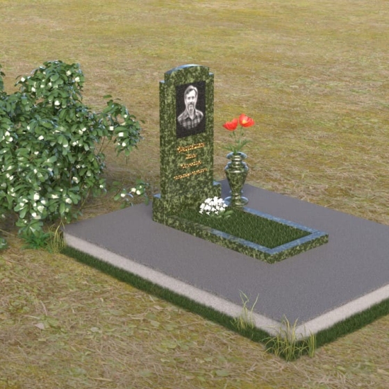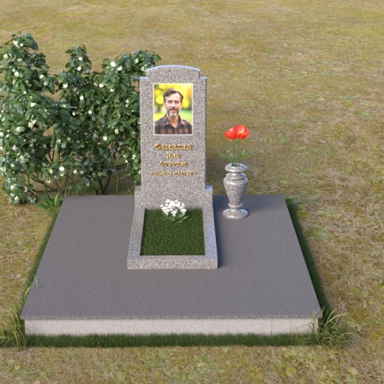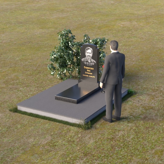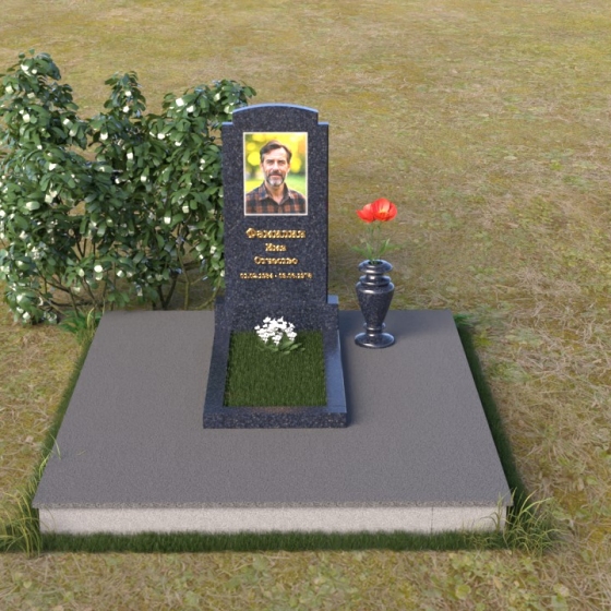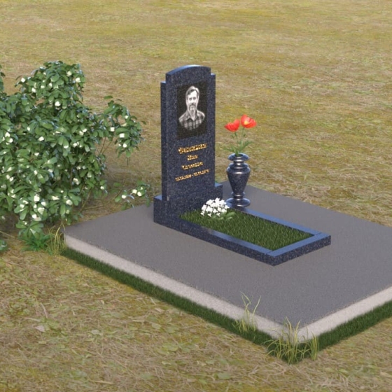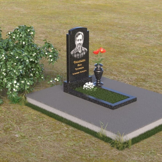 Основной акцент в этой модели сделан на контрасте фактур. Зеркальная полировка черного гранита Габбро-диабаз, из которого выполнена стела, создает эффект бесконечности, отражая небо и окружающий мир. На этом фоне особенно выразительно смотрится гравировка портрета и надписи, выполненные с ювелирной точностью. Нижняя часть стелы, переходящая в горизонтальную плиту, также выполнена из черного гранита, но уже с матовой обработкой, что придает композиции дополнительную глубину и текстуру. Рядом располагается ваза из того же гранита, выполненная в классическом стиле, предназначенная для живых цветов, которые станут символом памяти и любви.