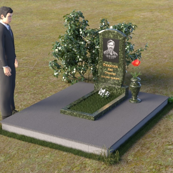 Данная модель предоставляет широкие возможности для индивидуального оформления. Портрет усопшего, выполненный методом гравировки, идеально вписывается в общую композицию, занимая центральное место на стеле. Золотистые буквы надписи, контрастируя с темным фоном полированного гранита, выглядят торжественно и выразительно. Мы рекомендуем выбирать фотографии высокого разрешения для достижения максимальной детализации и реалистичности портрета. Также возможно добавление дополнительных декоративных элементов, таких как эпитафии, религиозные символы или памятные даты. Небольшая подставка, выполненная в том же стиле, что и стела, гармонично дополняет композицию и может служить местом для возложения цветов. Элегантная ваза из черного гранита, расположенная рядом с надгробием, добавляет завершенность образу и позволяет сохранить свежесть цветов на длительное время.