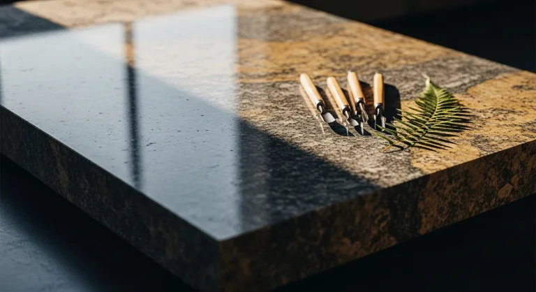 Полировка: Камень проходит до 7 этапов полировки, последовательно сменяя абразивные диски от грубых до тончайших войлочных кругов. Мы добиваемся глубокого зеркального блеска. Это не только эстетика - идеальная полировка закрывает естественные поры камня, делая его поверхность абсолютно гладкой и неуязвимой для влаги, пыли и грязи. Именно такая полировка раскрывает истинный цвет и глубину рисунка камня.