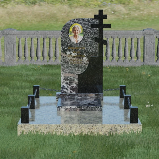 Игра контрастов — главная эстетическая особенность этого изделия. Сочетание глубокого темного камня с зеркальной полировкой и более светлого, фактурного гранита создает визуальный объем и подчеркивает торжественность момента. Такая форма идеально подходит для выражения скорби через красоту и долговечность. Плавные линии резьбы на переходе между элементами напоминают о том, что память о человеке не имеет острых углов, она течет сквозь время, оставаясь неизменной и чистой.