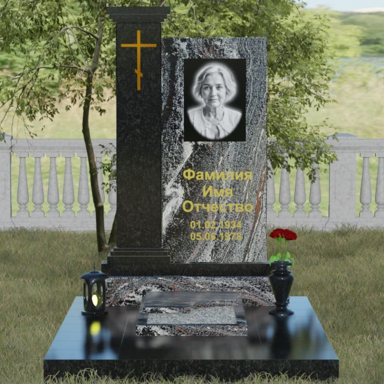 Композиция данного надгробия построена на гармоничном сочетании двух вертикальных элементов, установленных на массивное ступенчатое основание. Левая часть выполнена в виде величественной колонны с декоративным навершием в классическом стиле. На фронтальной стороне колонны расположена гравировка православного креста, покрытая сусальным золотом или имитирующим его составом, что придает мемориалу торжественный и одухотворенный вид. Правая часть — это лаконичная прямоугольная стела, предназначенная для размещения портрета и памятных надписей. Строгая геометрия линий подчеркивает внутреннюю силу и достоинство того, чья память здесь увековечена.