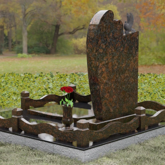 Представленный мемориальный ансамбль (Артикул 129) — это не просто памятный знак, а глубокое архитектурное высказывание, в котором застывшая в камне скорбь обретает форму высокого искусства. Величественная стела доминирует в композиции, представляя собой сложный симбиоз строгой геометрии и филигранной художественной резьбы. Центральным элементом является объемная фигура скорбящего ангела, выполненная в технике глубокого барельефа. Мастерски переданная пластика крыльев с детальной проработкой каждого перышка создает ощущение мягкости, которая парадоксальным образом контрастирует с твердостью натурального камня. Склоненный лик ангела и тонкие складки его одеяний, выполненные в матовом срезе, эффектно выделяются на фоне зеркально полированной поверхности основной плиты. В руках небесного покровителя застыла роза — символ вечной любви, чьи лепестки проработаны с исключительным вниманием к объему и естественности линий.