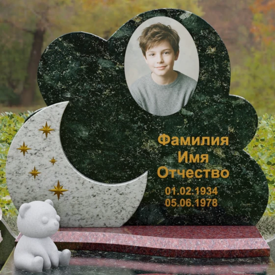 Данная мемориальная композиция — это воплощение нежности, глубокой любви и тихой грусти, застывшей в благородном камне. Выбор такой формы продиктован желанием выразить самые светлые чувства к ушедшему близкому человеку. Силуэт стелы, выполненный в виде мягкого, кучевого облака с плавными, округлыми очертаниями, символизирует покой и вечную жизнь души в небесных сферах. Асимметричная геометрия придает монументу индивидуальность, выделяя его среди строгих прямоугольных форм, и создает ощущение легкости, несмотря на внушительный вес натурального гранита. Особый акцент сделан на игре фактур и цветов: основная часть монумента из темного камня гармонично сочетается со вставкой из светлого гранита в форме изящного полумесяца. На этом светлом фоне выгравированы лаконичные золотые звезды, которые словно освещают путь памяти через десятилетия.