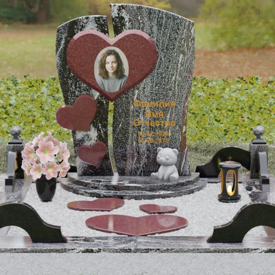 Этот величественный гранитный монумент представляет собой высокохудожественное произведение, в котором каждая линия наполнена глубоким смыслом. Композиция обелиска построена на волнующем контрасте разделения и единения. Массивная вертикальная плита словно рассечена плавной, изогнутой линией на две неравные части, символизируя разлом, произошедший в жизни. Однако эти части не распадаются — их крепко и неразрывно соединяет главное связующее звено: крупное, объемное сердце. Этот центральный элемент, выполненный в контрастном цвете (например, насыщенно-красном на фоне строгого черного или глубокого зеленого камня), служит идеальным обрамлением для портрета, акцентируя внимание на светлом образе ушедшего человека. Слева, вдоль изгиба, каскадом расположены еще три сердца меньшего размера, создавая ритмичный визуальный ряд, подобный биению любящей души. Вся поверхность камня, включая сложные криволинейные резы, отполирована до идеального зеркального блеска, придавая конструкции торжественность и монументальность.