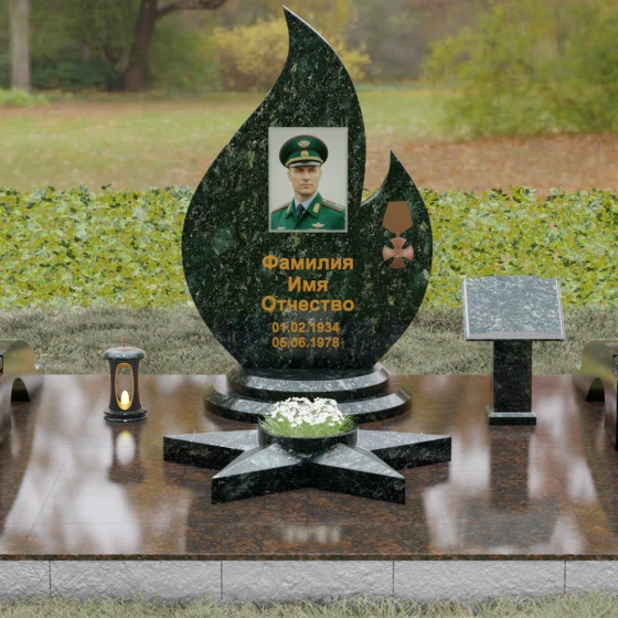 Центральное мемориальное изделие выполнено в уникальной форме застывшего пламени, которое стремится ввысь, символизируя неугасаемую энергию жизни. Плавные, текучие изгибы боковых граней переходят в изящное заостренное навершие, создавая динамичный и одновременно строгий силуэт. Особое внимание стоит уделить обработке камня: по всему периметру лицевой грани снята широкая фаска, которая благодаря безупречной зеркальной полировке создает великолепную игру света и тени, подчеркивая объем и скульптурность формы.