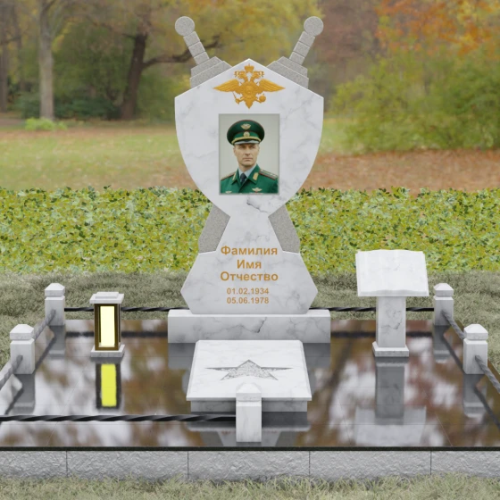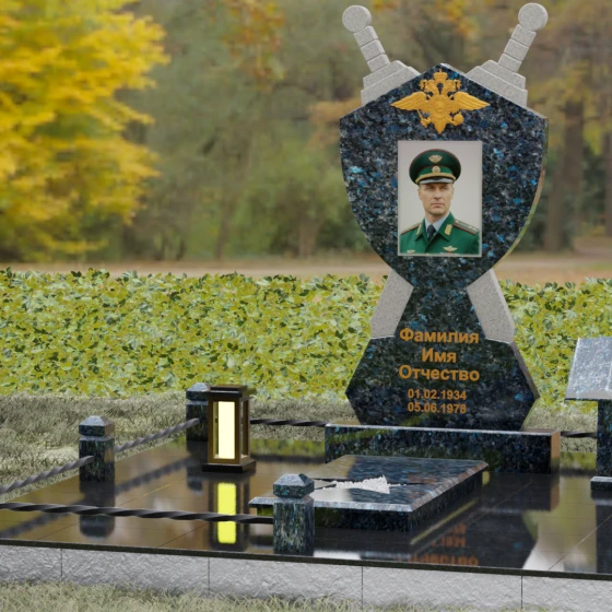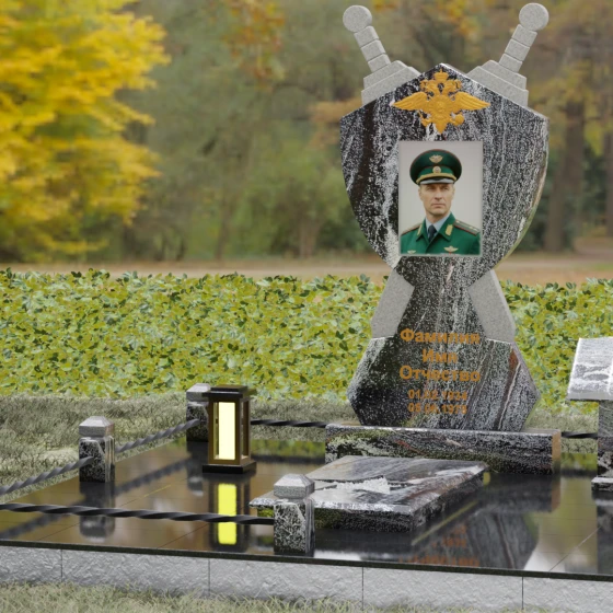 Кому подойдет: Данная мемориальная композиция разработана специально для тех, кто посвятил свою жизнь служению Отечеству. Она станет идеальным выбором для оформления места захоронения профессионального военного, сотрудника правоохранительных органов, ветерана или человека, чья жизнь была примером мужества и дисциплины. Строгие линии, военная символика и монументальность формы без лишних слов расскажут о силе характера, доблести и чести того, кто нашел здесь свой последний приют.