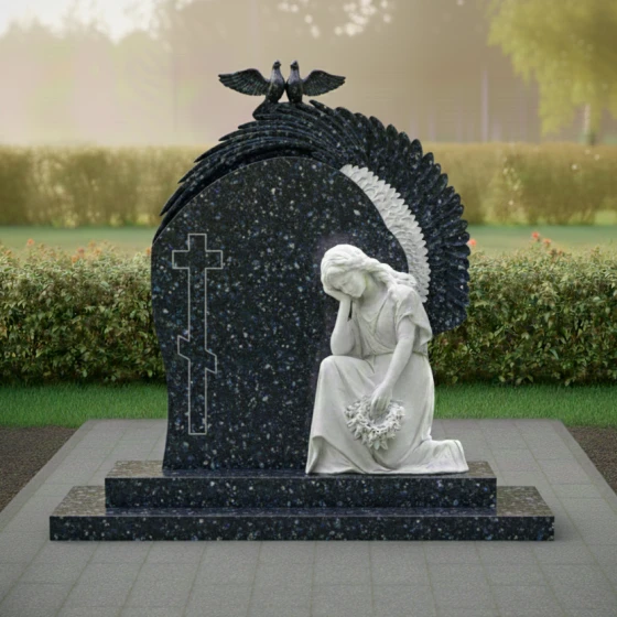 Гранитный монумент (Артикул: ПН 042) представляет собой глубокое художественное произведение, воплощающее вечную скорбь и светлую память. Его дизайн не просто отражает эстетику, но и погружает в мир символов, говорящих о любви, утрате и надежде. Центральный элемент композиции — это массивное вертикальное надгробие, выполненное в форме арки, словно обнимающей пространство памяти. Его левая грань обработана с идеальной полировкой, создающей зеркальную поверхность глубокого черного цвета, которая, словно бездонное зеркало, отражает мир, призывая к созерцанию. На этой полированной поверхности выгравирован лаконичный православный крест, чей строгий абрис с дополнительной нижней перекладиной, символизирующей подножие, и верхней короткой табличкой, выполнен в технике, которая позволяет ему слегка выступать над основной плоскостью, создавая эффект игры света и тени. Правая часть надгробия имеет плавный, волнообразный изгиб, переходящий в объемную резьбу, изображающую крыло. Каждое перо этого крыла вырезано с потрясающей детализацией, его матовая, светлая поверхность контрастирует с глубоким черным фоном, создавая ощущение легкости и невесомости. Эта игра контрастов — между блеском полированного гранита и матовой фактурой резьбы — придает монументу невероятный объем и глубину, заставляя его оживать под лучами света. Венчает композицию изящная скульптура, изображающая скорбящего ангела, преклонившего колени. Его фигура, выполненная из светлого камня, словно излучает внутренний свет, подчеркивая нежность и уязвимость. Голова ангела склонена, руки сложены на груди, в них он держит венок из цветов, каждый лепесток которых тщательно проработан, придавая венку реалистичный и трогательный вид. Над аркой, на ее вершине, расположены две белые голубки, символизирующие чистоту души и мир. Их фигуры выполнены в матовом светлом камне, что еще больше подчеркивает их символическое значение. Весь ансамбль покоится на двухступенчатом основании из черного полированного гранита, которое придает монументу устойчивость и завершенный вид. Контраст между матовыми элементами резьбы и блеском полированного камня создает удивительную игру света и тени, которая меняется в зависимости от освещения, придавая монументу динамичность и глубину. Это не просто памятник, это произведение искусства, которое говорит о вечных ценностях, о скорби и надежде, о памяти, которая живет в сердцах. Благоустройство участка выполнено с той же тщательностью и вниманием к деталям. Монумент установлен на массивный гранитный цоколь, придающий конструкции устойчивость и монументальность. Надгробная плита, выполненная в едином стиле со стелой, полностью покрывает пространство под памятником, создавая законченный и ухоженный вид, что значительно упрощает уход за местом захоронения. Отсутствие открытого грунта не только практично, но и эстетично, подчеркивая целостность композиции.