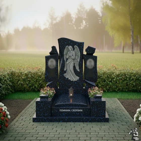 Особое внимание привлекает искусно выполненная резьба на центральной части монумента. Здесь изображен ангел с опущенными крыльями, склонивший голову в молитве или глубокой скорби. Каждая деталь его одеяния, каждая складка ткани, каждое перо на крыльях проработаны с невероятной точностью. Матовая фактура резьбы контрастирует с зеркальной полировкой основного камня, создавая потрясающую игру света и тени, которая придает изображению объем и глубину. Кажется, что ангел вот-вот оживет, наполняя пространство тихим утешением. Справа и слева от центрального изображения ангела, на боковых элементах, расположены две вставки овальной формы, предназначенные для портретов усопших, их матовая поверхность мягко выделяется на фоне глянцевого камня, создавая гармоничный акцент.