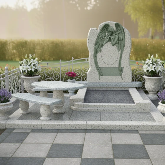 Представляем вашему вниманию ритуальное изделие Артикул: ПН 098 — мемориальный комплекс, который воплощает в себе глубокую скорбь и вечную память, заключенную в камне. Центральный элемент композиции — стела, выполненная в форме изящной арки, словно врата в иной мир, или раскрытая книга, хранящая бесценные воспоминания. Ее верхняя часть имеет плавный, округлый изгиб, который мягко переходит в строгие вертикальные линии, создавая ощущение завершенности и гармонии. Особое внимание привлекает объемная резьба, изображающая скорбящего ангела с опущенной головой и сложенными крыльями, расположенного на фронтальной стороне стелы. Каждая деталь его фигуры — от пера на крыльях до складок одеяния — выполнена с поразительной точностью, подчеркивая мастерство резчика и придавая изображению пронзительную реалистичность. Фактура камня играет на контрастах: зеркальная черная полировка основной поверхности стелы эффектно оттеняет светлый, матовый срез камня на резных элементах, создавая выразительный визуальный объем и глубину. Этот контраст усиливает эмоциональное воздействие и подчеркивает художественную ценность комплекса.