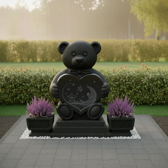 Геометрия модели сверху донизу продумана до мелочей. Основная стела, выполненная в виде медвежонка, имеет плавные, округлые линии, что создаёт ощущение мягкости и уюта. Фигура установлена на ступенчатом основании, которое придаёт всей конструкции дополнительную устойчивость и монументальность. Каждая ступень основания, как и сам медвежонок, имеет идеально отполированные грани, отражающие свет и создающие игру теней. Фактура камня демонстрирует великолепный контраст: зеркальная чёрная полировка основной части стелы и надгробной плиты эффектно сочетается с более матовыми, но при этом гладкими поверхностями резных элементов. Это создаёт ощущение глубины и многогранности, подчёркивая каждую деталь.
